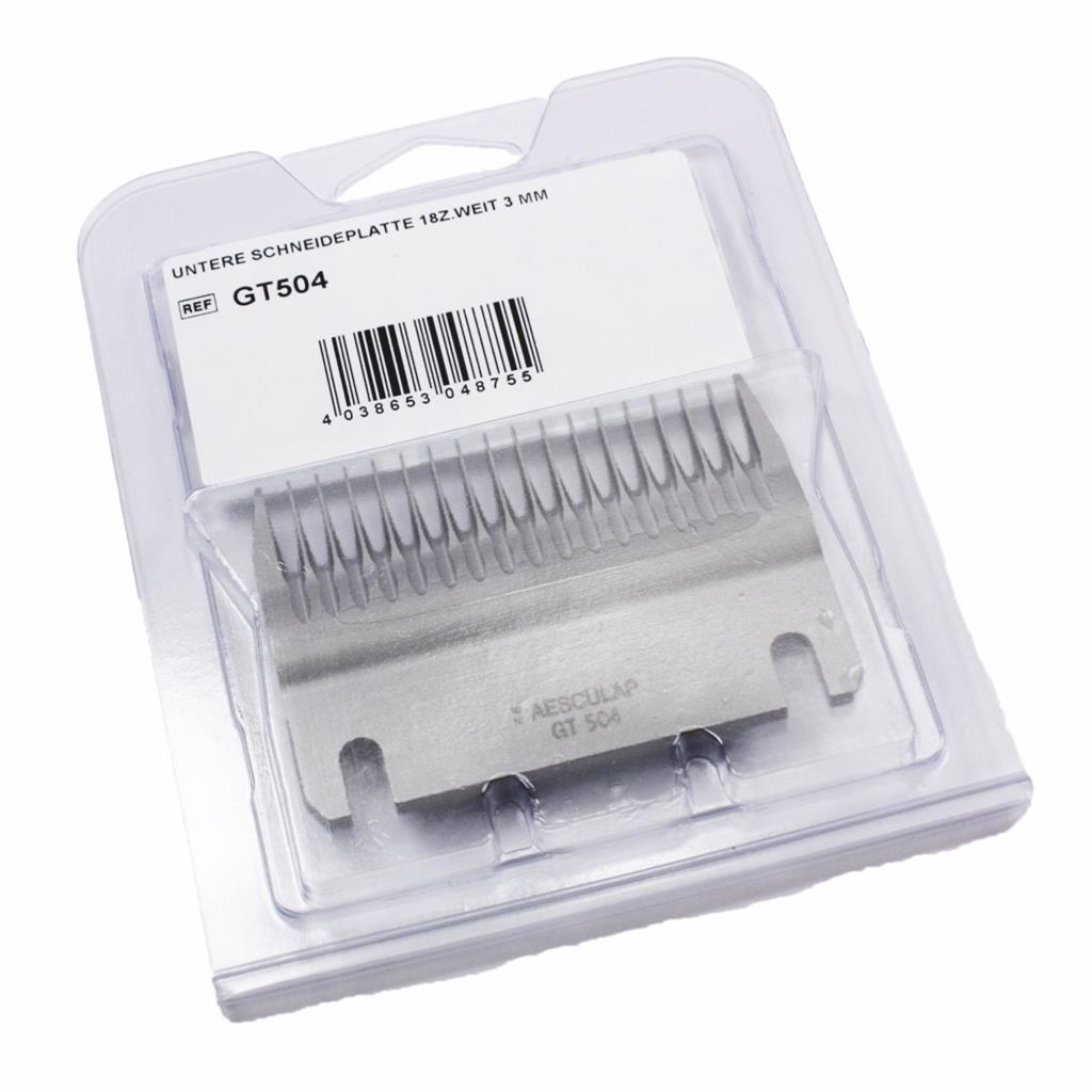 Der Scherkopf »Aesculap GT 504« mit einer Schnitthöhe von 3mm (untere Schneidplatte mit 18 Zähnen) ist geeignet für Rinder, feinwollige Schafe und Einzelschafe
