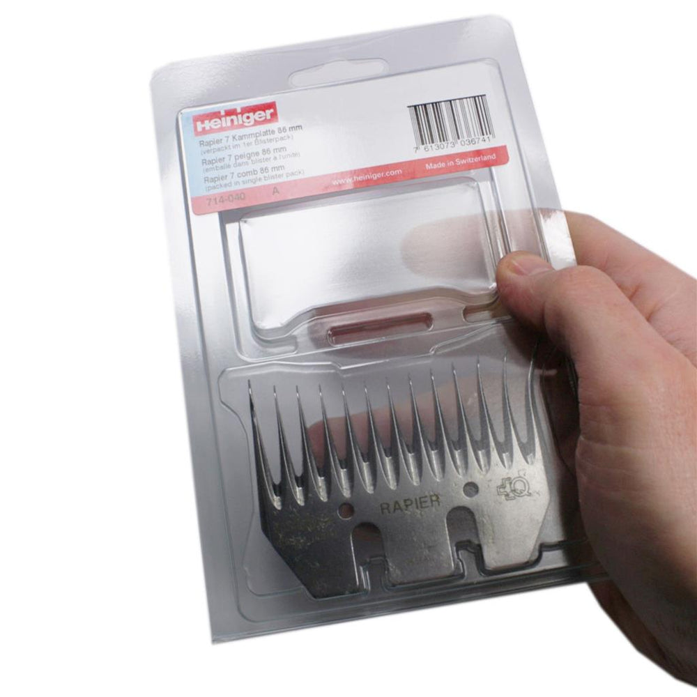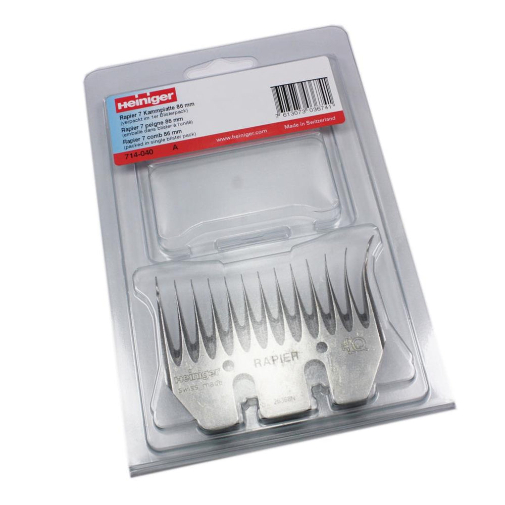 Heiniger Rapier 7 714-040 Schermesser 86mm. Heiniger Schermesser für die professionelle Universal Schur. Der ideale Kamm für schwierige Bedingungen. Aus Spezialstahl gefertigte Schermesser mit langer Haltbarkeit. Mehrmaliges Nachschleifen ist mit den Schermessern möglich.
