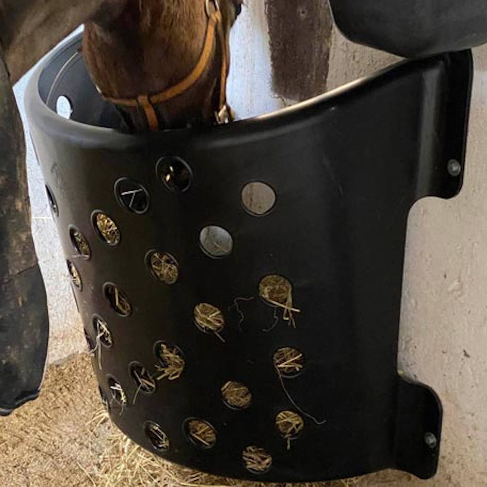 Durch die Montage an der Wand schafft sich der Heuspender selbst ein großes Fassungsvolumen. Das Heu liegt immer luftig und überflüssiges Wasser kann ablaufen. Die Pferde schleudern weniger Futter in die Box was zu geringerem Futterverlust und einer effizienteren Futternutzung führt. Die Box bleibt zudem länger sauber bei hygienischer Fütterung ohne Futterverlust. Der Heuspender unterstützt gesunde Fresshaltung und reduziert Staubbelastung.