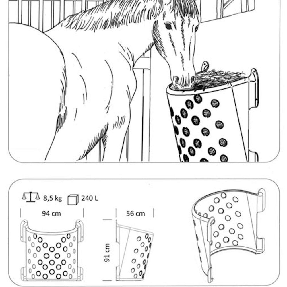 - für bis zu 14 kg Heu bzw. ca. 240 Liter Fassungsvermögen