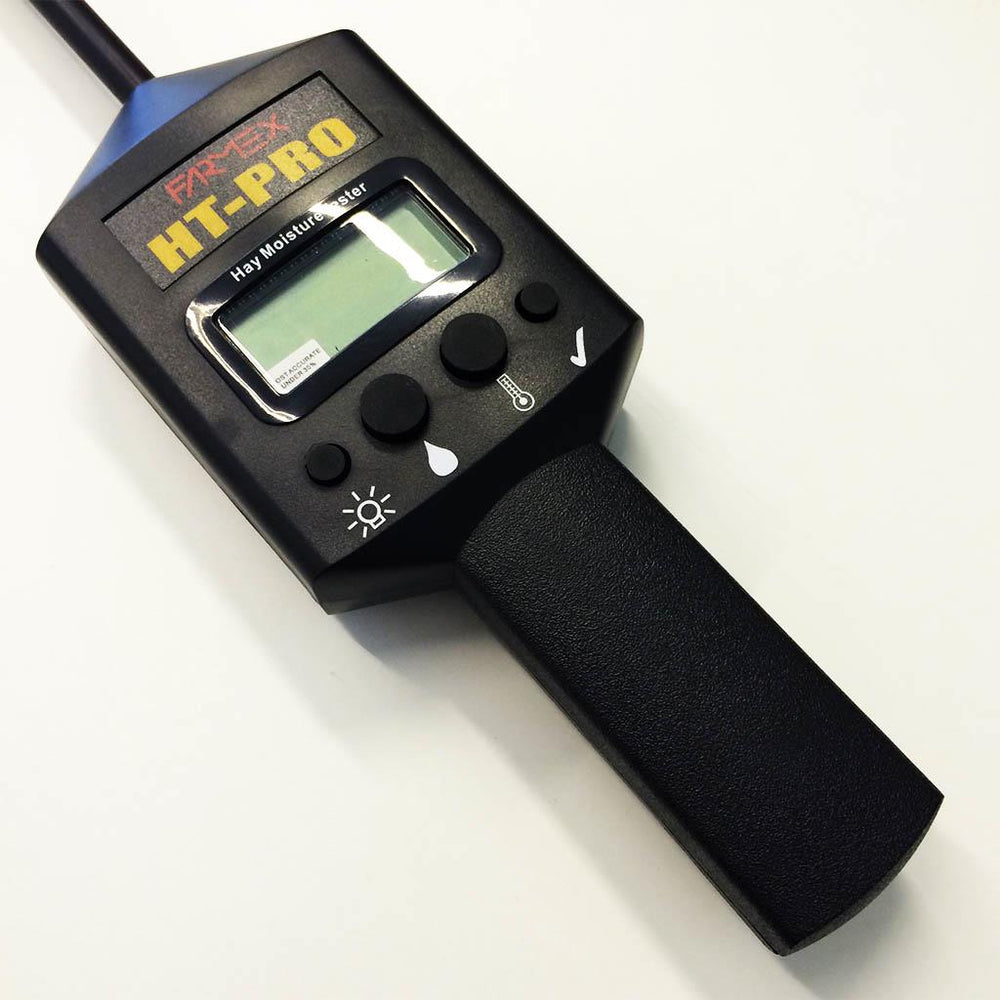 Mit dem Heumessgerät / Heufeuchtigkeitsmesser "Hay Master" (1x9V) messen Sie Feuchtigkeit von 8% bis 44% und Temperatur von 0° bis 107° Celsius unkompliziert in Heu- und Strohballen. Das Heumessgerät wird mit einem 9v Block betrieben und ist mit 339g mobil und leicht zu handhaben. Das Gerät kann für kleine und große Quarderballen sowie Rundballen mit verschiedener Ballendichte verwendet werden. Der Messstab ist 50cm lang, angespitzt und kommt mit seinen 7mm Durchmesser gut in jeden Ballen. Der Hay Master ist durch ein einfaches Clip-Modul bei Bedarf in weniger als 20 Sekunden kalibriert. Die Hintergrundbeleuchtung ist einschaltbar.