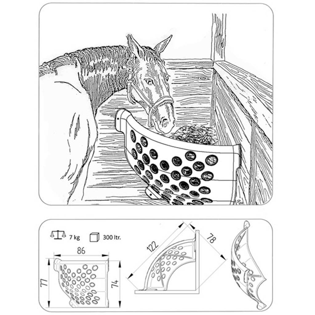 Für den Heuspender wird sehr hochwertiger und langlebiger Kunststoff verwendet. Dieser ist UV-beständig, formstabil und sehr strapazierfähig. Alle Ecken und Kanten sind abgerundet.