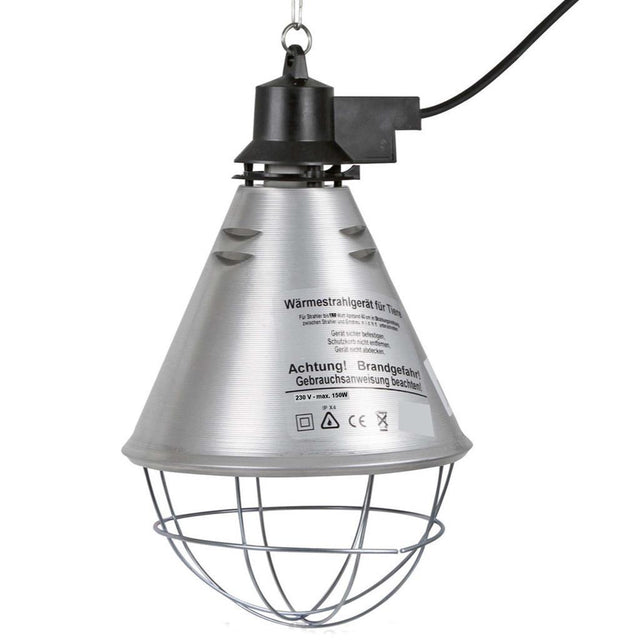 Die Stalllampe »Classic« Wärmelampe für Infrarotbirne, Infrarotstrahler mit Kabellängen von 2,5m-5m. Reflektor mit Kette, Karabinerhaken und Deckenhaken, Kabel mit Schukostecker, 230 Volt, maximal 150 Watt mit 2,5m oder 5m Kabel. Die Wärmelampe ist ideal zur Aufzucht von Ferkeln und Küken und lässt sich leicht an beiliegender Kette aufhängen.