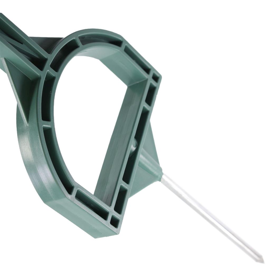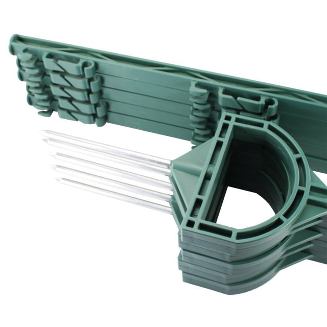Mit dem Steigbügel lässt sich der Weidezaunpfahl einfach und trittsicher an Ihrem Weidezaun eintreten. Ein eingespritzter verzinkter 8mm Stahlnagel am Fußende der Weidezaunpfähle und dessen verwindungsfreihes Profil sorgen für festen Stand. Die beiden Trittstege links und rechts über dem Stahlnagel verteilen die auf den Weidezaunpfahl wirkenden Kräfte in weichen und harten Böden. Die insgesamt 16 Ösen entlang der Weidezaunpfähle mit Steigbügeltritt verteilen sich auf 4 schmale Weidezaunband-Ösen unten, 4 breitere Weidezaunband-Ösen und 8 Ösen für Weidezaunseil jeweils oben am Weidezaunpfahl. Schließlich macht die grüne Farbe die Steigbügelpfähle zum angenehm dezenter Blickfang an Ihrem Weidezaun.