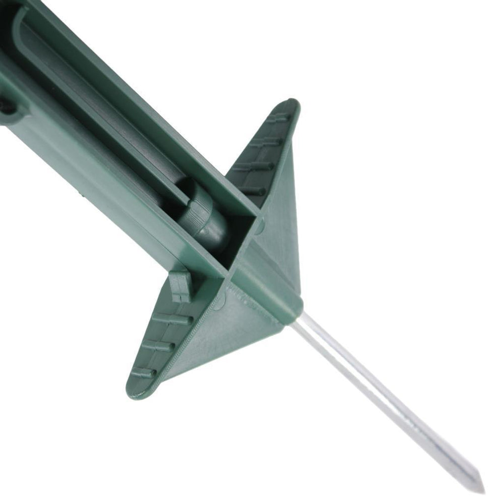 Die Weidezaunpfähle »Dreieckstritt« 10x, Kunststoffpfähle sind grün und 75cm lang (5 Band- und 2 Seil-Ösen). Durch die Länge von 0,75m eignen sich diese Doppeltritt Wildabwehrpfähle exzellent zur Abwehr von Wild wie Dachse, Otter, Füchse, Kitze, Hasen, Marder und andere Wildtiere. Der Wildabwehr Kunststoffpfahl mit Dreieckdoppeltritt ermöglicht festen und sicheren Stand auch auf unebenen Böden.