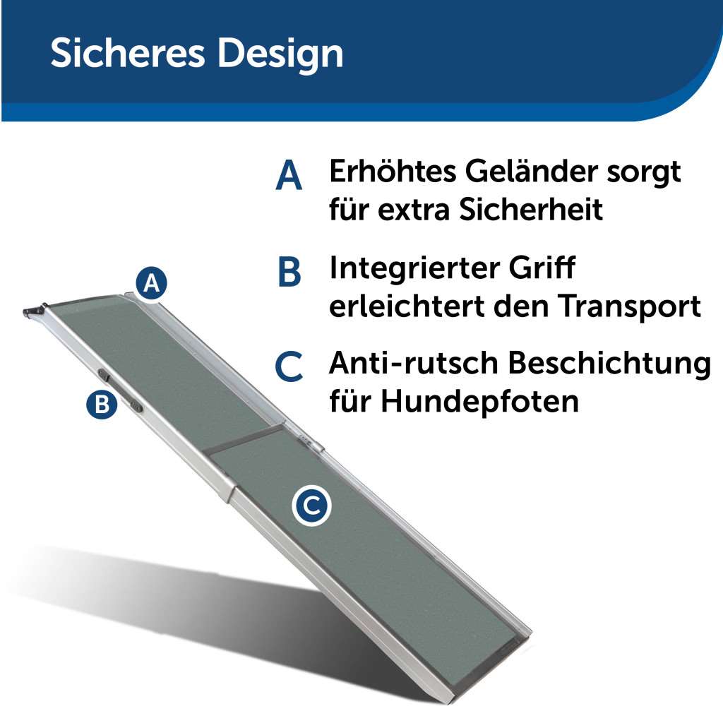 - rutschfest: Die rutschfeste Oberfläche und die seitlichen Führungen ermöglichen ein sicheres Ein- und Aussteigen des Vierbeiners