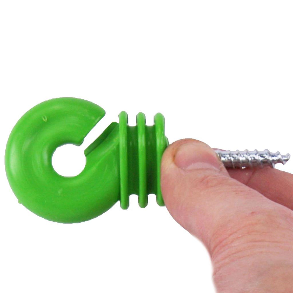 Der Ringisolator »Jumbo« 25x, für Litze, Band ist grün. Mit gefrästem Holzgewinde - somit leichter einzudrehen. Wetterfest, UV-stabilisiert, für Litzen und schmale Bänder. Der Jumbo Ringisolator ist aus Polyethylen, großer Ring, mit verz. durchgehender Eisenstütze 6mm. Beutel à 25 Stück
